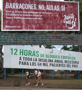 Sin embargo, hay que reconocer que algo visibles sí nos hemos vuelto últimamente. Mira que la Generalitat se ha limpiado el escroto con las sentencias del Supremo que pedían dar un 25% de clases en castellano (sólo una cuartita parte, oiga, no pedimos más), mira que se ha multado a los comerciantes que se empeñaban en tener el rótulo sólo en castellano…, pues ha sido llegar el “procés” y aparecer algún que otro cartelito en castellano (al más puro estilo del régimen cubano) para pedir el voto a los “indígenas” del cinturón industrial que todavía no se han convertido a la fe verdadera.