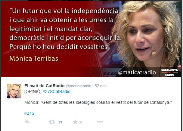autonómicos con nuestro mensaje. Mónica Terribas cobra un muy buen sueldo que pagan todos los catalanes, pero en su programa matinal de la radio pública ha dicho que “el futuro quiere la independencia y ayer obtuvo en las urnas la legitimidad y el mandato claro democrático y nítido de conseguirla. Porque vosotros lo habéis decidido”. Otra que no ve a la mitad de los catalanes, ni con unas gafas de Mortadelo, y que ni disimula que sólo habla para los suyos.